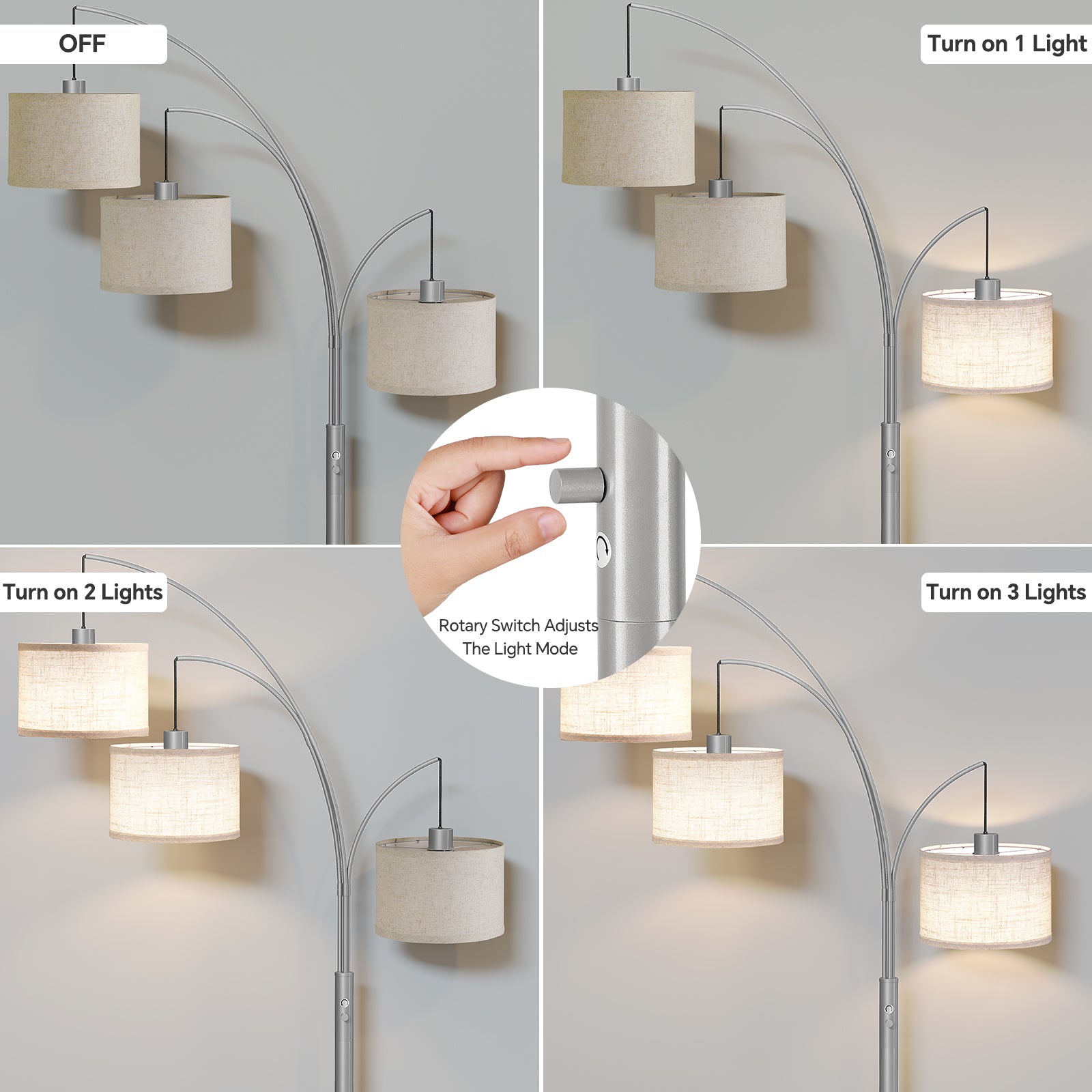 - Rotary Switch and Three Light Modes: SUNMORY 3 lights arc floor lamp is configured with 3 light modes by convenient Rotary switch, light 1 light, light 2 light and 3 light by knob switch, different light modes allow you to have gentle ambient/accent lighting as well as intensified reading and work light. The E26 lamp holder can also be used with other types of bulbs below 60W, such as G25/ST58/A19/T45/RGB and so on. (Note: bulbs are not included in this arched floor lamps.