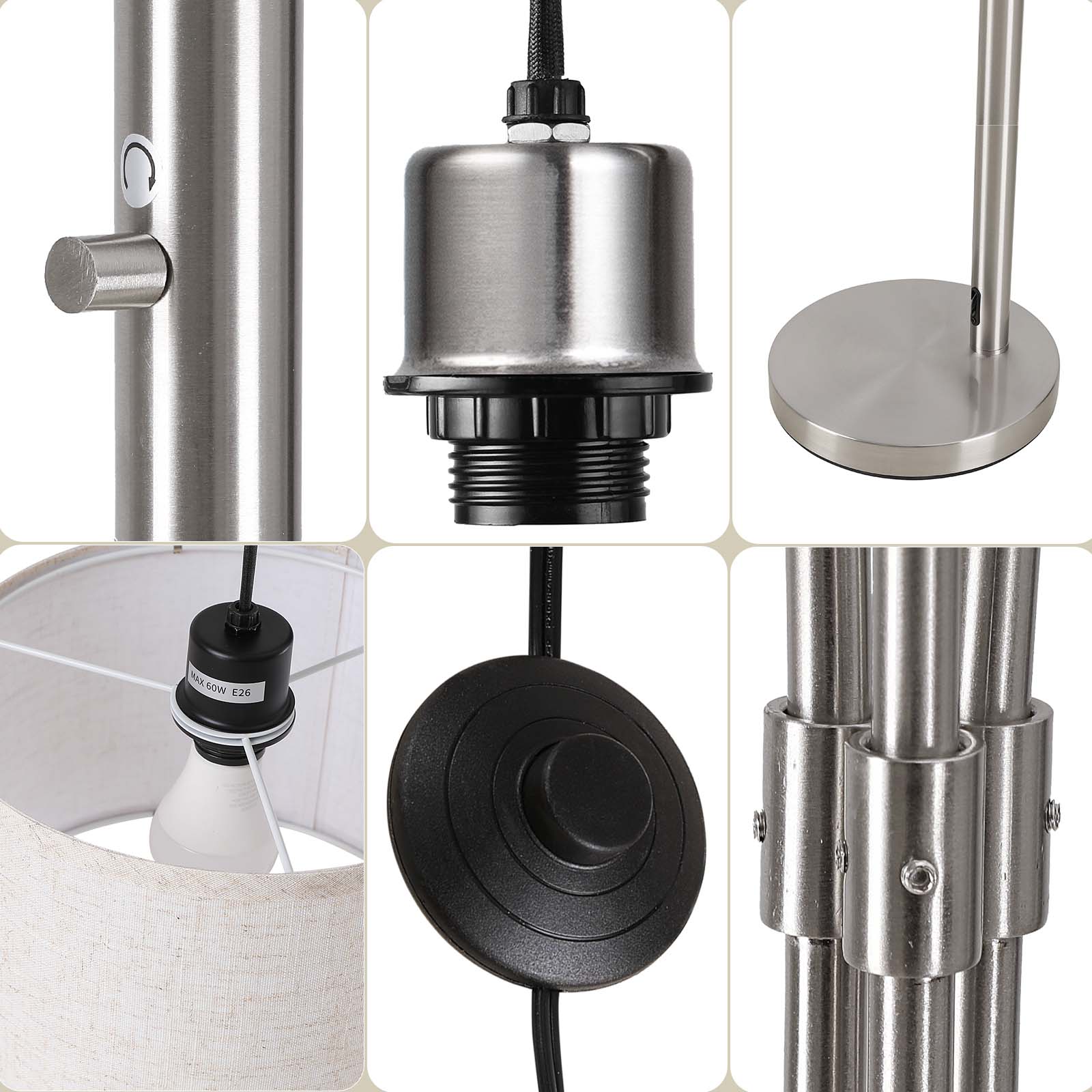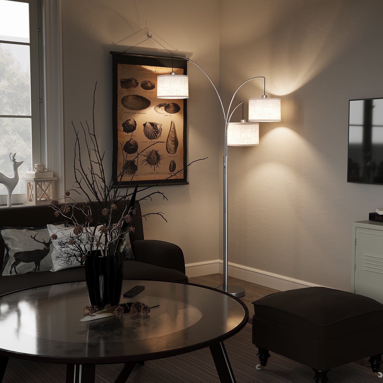 - 3 Lamps Rotatable Arc Lamp: Our living room lamp's arc stanchion can be rotated 360(need to loosen and tighten the small screws for adjustment), you can easily rotate the tall lamp's stanchion to the desired angle and complete your specific look. This standing lamp also comes with three linen drum shades, giving you a cozy and soft sense of ambiance, able to fit perfectly into any decorative style of living room, bedroom, office.