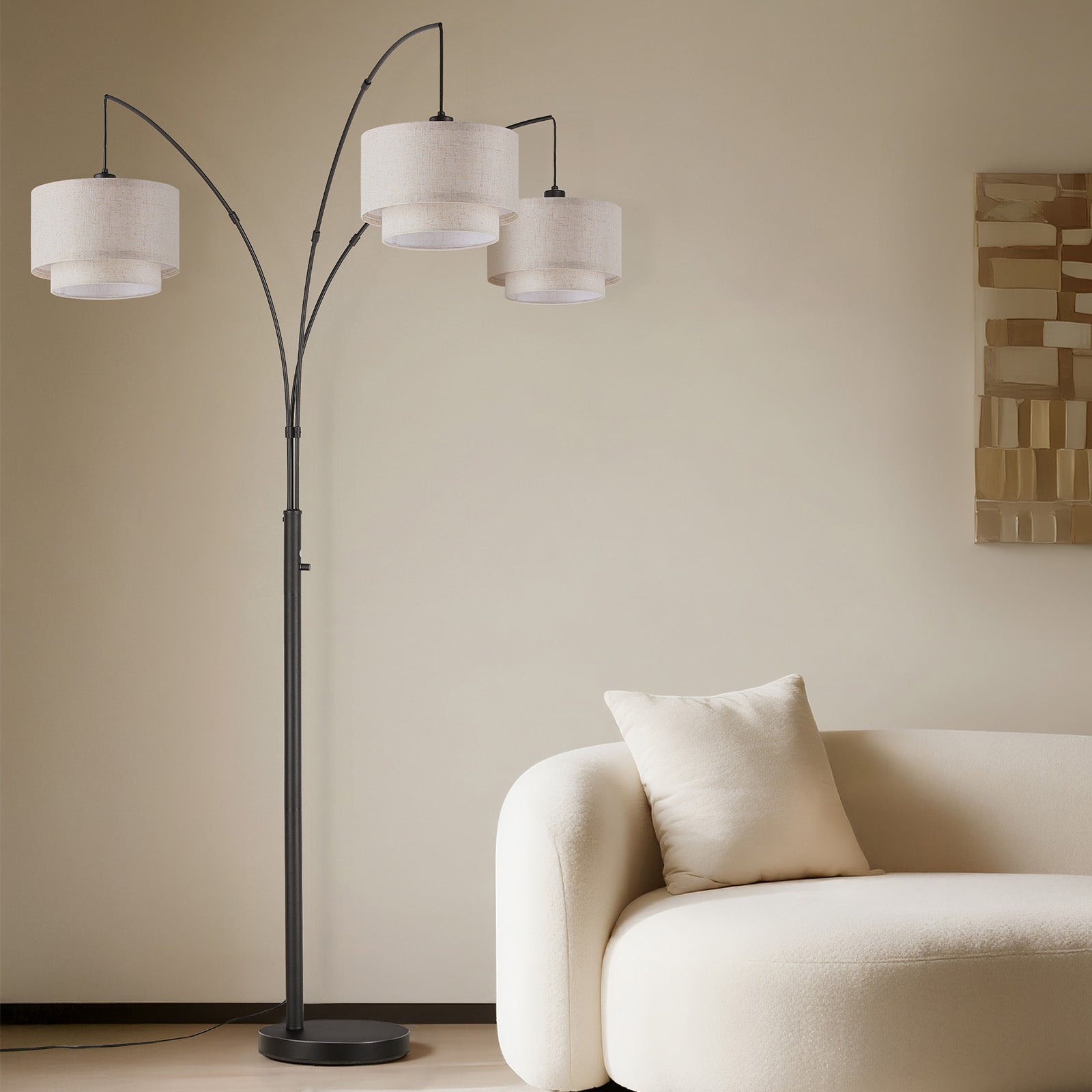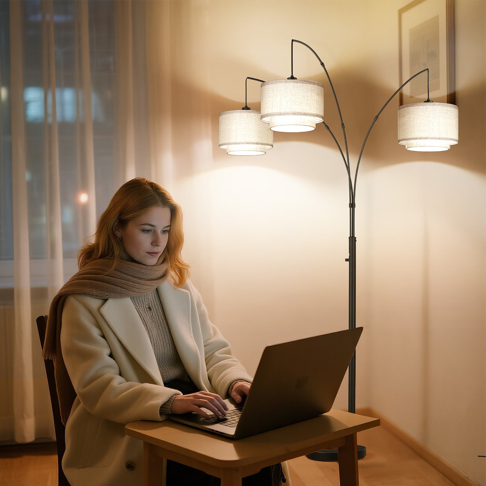 - 【Stylish Arc Design Floor Lamp】Featuring a sleek, curved arc structure, this floor lamp adds a touch of modern elegance to any bedroom, living room, or reading nook. The three Beige Dual Linen lampshades diffuse warm, gentle light, creating a cozy and inviting atmosphere perfect for relaxation, reading, or accentuating your decor.