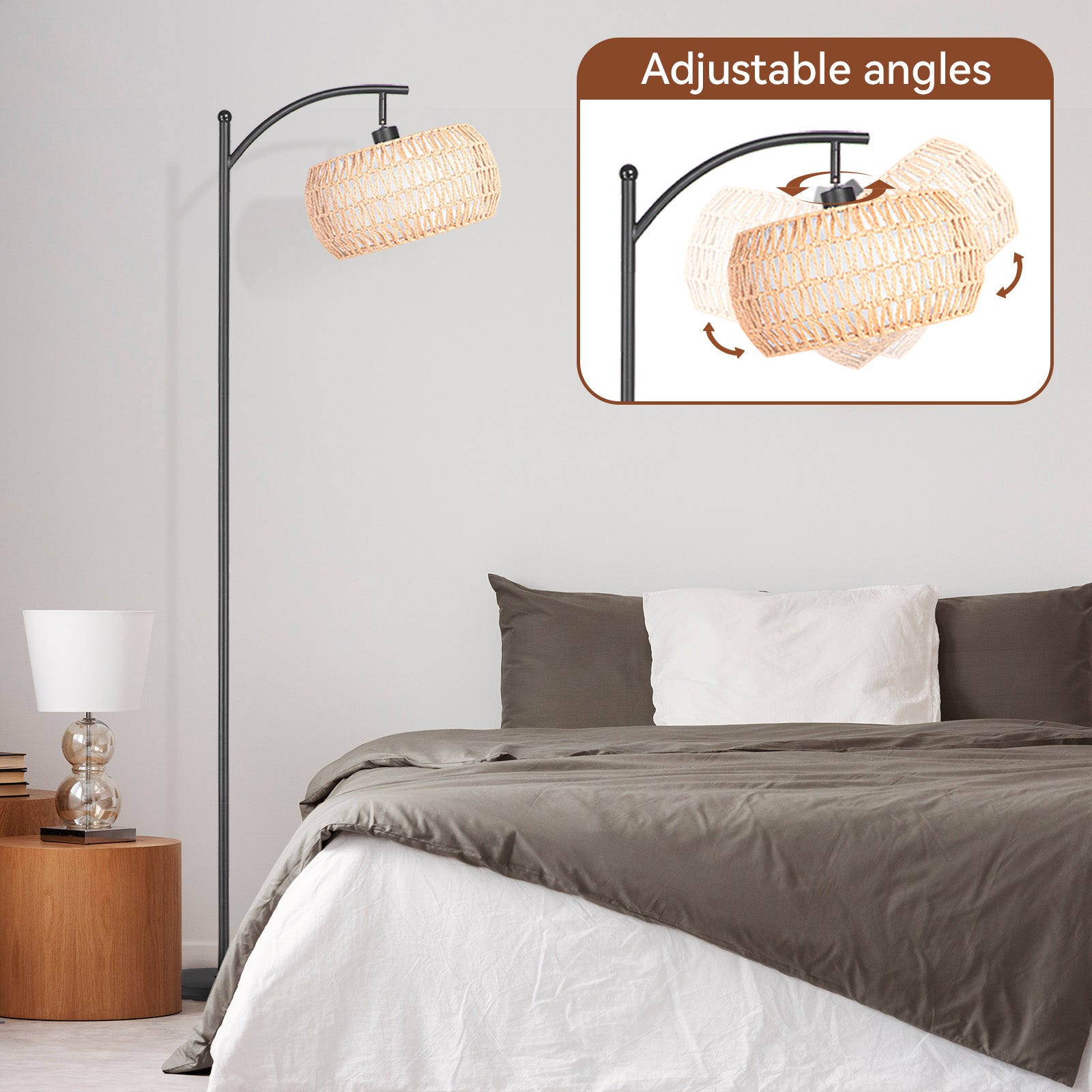 SUNMORY 63'' Dimmable Arc Rattan Floor Lamp, Black Standing Lamp with Rattan & Fabric Double Drum Shade, Boho Farmhouse Tall Lamp for Living Room, Lamps for Bedroom 5764819847